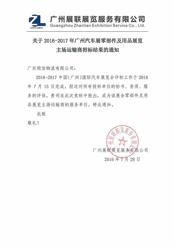 經(jīng)過一輪緊張、嚴(yán)謹(jǐn)?shù)恼型稑?biāo)工作,協(xié)會會展物流服務(wù)中心·廣東順信物流有限公司成功憑借優(yōu)良的資質(zhì)和服務(wù),順利成為2016-2017年廣州國際汽車零部件及用品展覽會的主場承運商,這是繼2014年、2015年連續(xù)兩年成功承辦該展覽主場承運業(yè)務(wù)的又一新篇章。