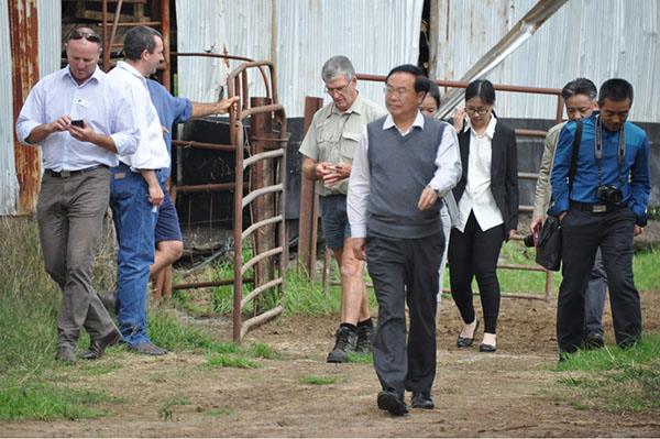 下午,工作組參觀了珀斯西北地區的一個牧場,該牧場占地1000公頃,主要飼養的牛的品種為母牛、公牛、種牛等,主要為草飼。牧場每年的降雨量充足,草場非常肥沃。之后,還參觀了當地的農業灌溉設施。參觀過程中,工作組也與西澳農業及食物部活牛項目的負責人邁特和戴爾也建立了聯系,他們兩位主要致力于當地的活牛產業鏈的發展,也給工作組詳細介紹了當地的活牛養殖及出口情況。工作組組長馬仁洪向他們介紹了中澳21世紀海上物流大通道及作為早期收獲項目的活牛產業鏈建設推進計劃,副組長李志安也向他們介紹了活牛項目的具體進展情況。最后,馬會長向邁特先生贈送了“中澳21世紀海上物流大通道”規劃圖。