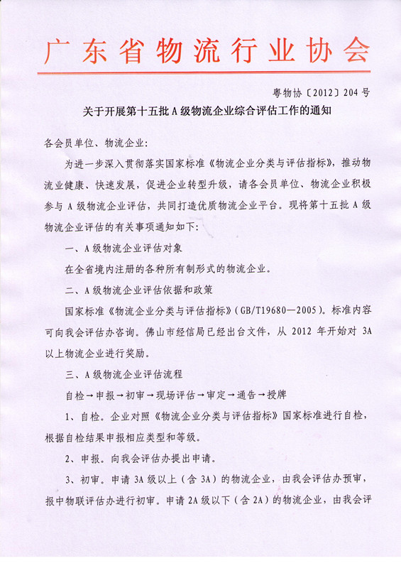 為進一步深入貫徹落實國家標準《物流企業分類與評估指標》,推動物流業健康、快速發展,促進企業轉型升級,請各會員單位、物流企業積極參與A級物流企業評估,共同打造優質物流企業平臺。現將第十五批A級物流企業評估的有關事項通知如下: