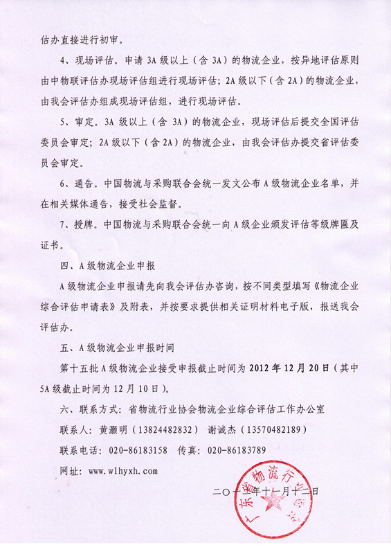 6、通告。中國物流與采購聯合會統一發文公布A級物流企業名單,并在相關媒體通告,接受社會監督。