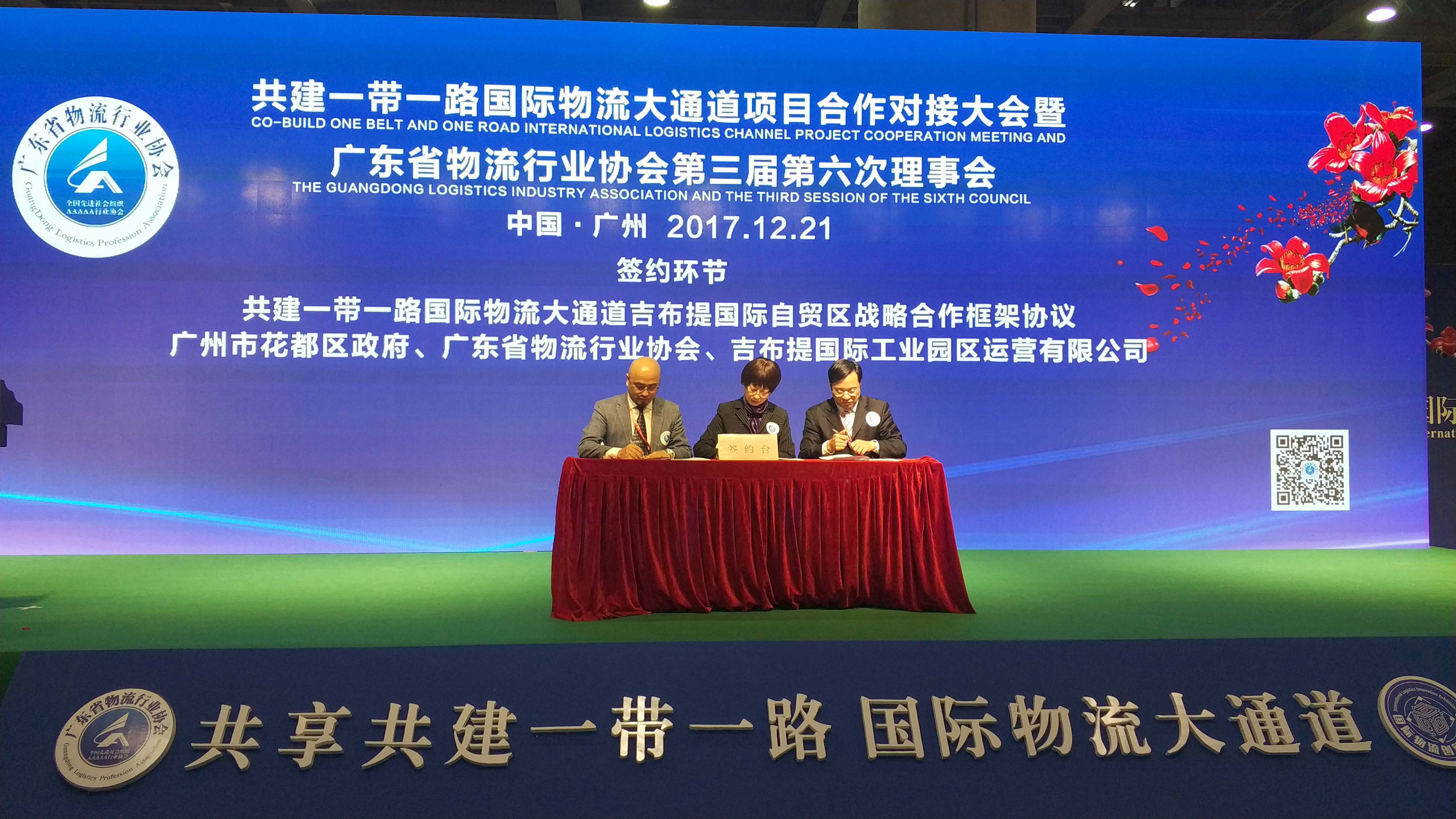 為深入?yún)⑴c共建“一帶一路”國(guó)際物流大通道建設(shè),12月21日,在協(xié)會(huì)舉辦的“共建一帶一路國(guó)際物流大通道項(xiàng)目合作對(duì)接大會(huì)暨廣東省物流行業(yè)協(xié)會(huì)第三屆第六次理事會(huì)”,在參會(huì)人員的共同見證下,協(xié)會(huì)梁玉霞秘書長(zhǎng)、廣州市花都區(qū)政府葉志良區(qū)長(zhǎng)、吉布提國(guó)際產(chǎn)業(yè)園邵月波執(zhí)行總經(jīng)理共同簽訂《共建“一帶一路”國(guó)際物流大通道吉布提自貿(mào)園區(qū)戰(zhàn)略合作框架協(xié)議》。