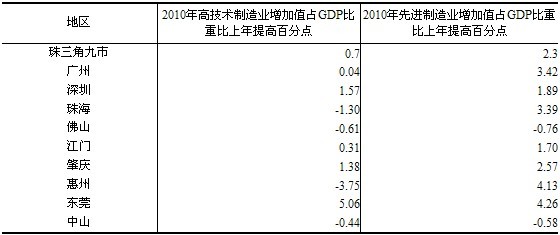 表1:2010年珠三角地區高技術制造業、先進制造業增加值占比變動情況表