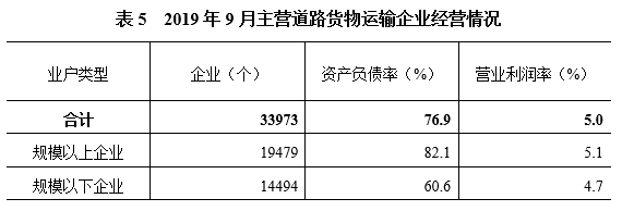 2019年9月主營道路貨物運輸業務的企業平均資產負債率為76.9%,營業利潤率為5.0%。個體經營戶平均營業收入為2.44萬元,燃油費、通行費、保險費、維修費等支出為1.55萬元。此外,還需承擔車輛折舊費用、人工成本等。