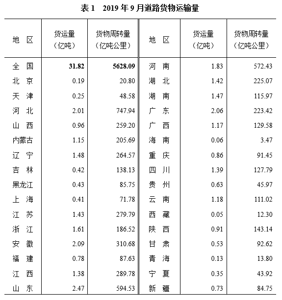 2019年9月,全國營業性貨運車輛完成貨運量31.82億噸,貨物周轉量5628.09億噸公里,平均運距為177公里。