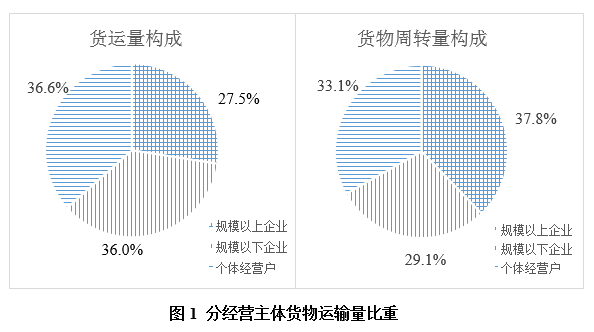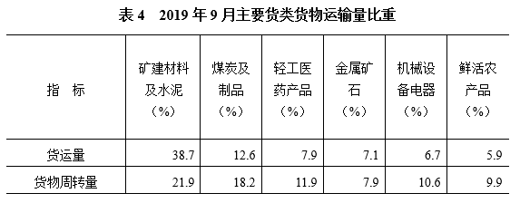 2019年9月規模以上企業、規模以下企業、個體戶分別完成貨運量8.75、11.44、11.63億噸,占比為27.5%、36.0%、36.6%;貨物周轉量2125.26、1637.20、1865.62億噸公里,占比為37.8%、29.1%、33.1%;平均運距分別為243、143、160公里。