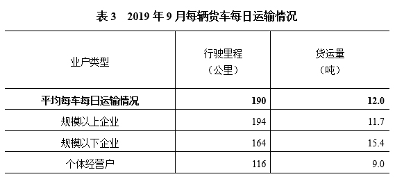 2019年9月每輛貨車每日平均行駛190公里,運輸貨物12.0噸。每噸貨物運輸距離平均為177公里。