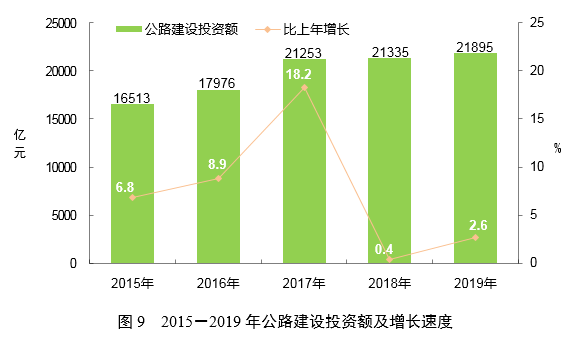 全年完成公路建設投資21895億元,比上年增長2.6%。其中,高速公路建設完成投資11504億元,增長15.4%;普通國省道建設完成投資4924億元,下降10.3%;農村公路建設完成投資4663億元,下降6.5%。