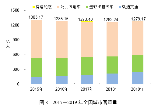 全年完成城市客運量1279.17億人,比上年增長1.3%。其中,公共汽電車完成客運量691.76億人,下降0.8%,其中BRT完成客運量17.47億人,完成公共汽電車運營里程354.13億公里,增長2.3%;軌道交通完成客運量238.78億人,增長12.2%,完成運營車公里41.43億車公里,增長17.5%;巡游出租汽車完成客運量347.89億人,下降1.1%;客運輪渡完成客運量0.73億人,下降9.0%。