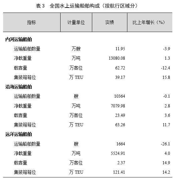 年末全國擁有水上運輸船舶13.16萬艘,比上年下降4.0%;凈載重量25684.97萬噸,增長2.3%;載客量88.58萬客位,下降8.0%;集裝箱箱位223.85萬標準箱,增長13.8%。