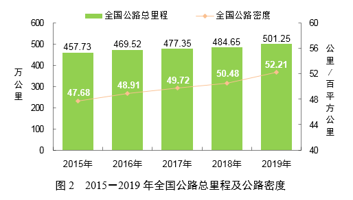年末全國公路總里程501.25萬公里,比上年增加16.60萬公里。公路密度52.21公里/百平方公里,增加1.73公里/百平方公里。公路養護里程495.31萬公里,占公路總里程98.8%。