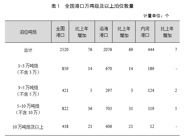 年末全國港口擁有萬噸級及以上泊位2520個,比上年增加76個。其中,沿海港口萬噸級及以上泊位2076個,增加69個;內河港口萬噸級及以上泊位444個,增加7個。