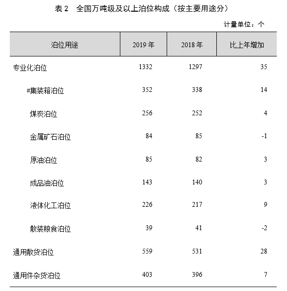 全國萬噸級及以上泊位中,專業化泊位1332個,比上年增加35個;通用散貨泊位559個,增加28個;通用件雜貨泊位403個,增加7個。