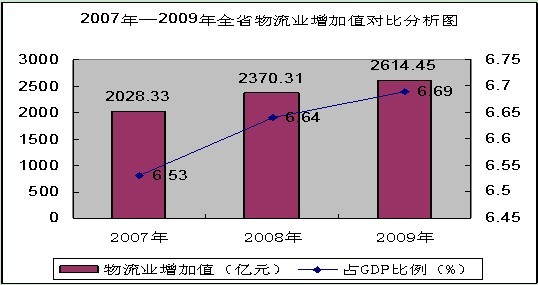 2009年,廣東省物流業(yè)增加值為2614.45億元,按現(xiàn)價(jià)計(jì)算,同比增長(zhǎng)10.30%;占同期全省GDP的比例為6.69%,與去年同期相比上升了0.75個(gè)百分點(diǎn)。