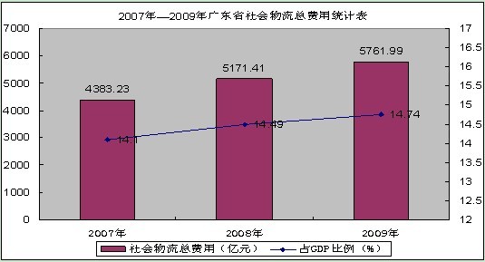 2009年,廣東省社會(huì)物流總費(fèi)用為5761.99億元,按現(xiàn)價(jià)計(jì)算,同比增長(zhǎng)11.42%;占同期全省GDP的比例為14.74%,與去年同期相比上升了1.72個(gè)百分點(diǎn)。