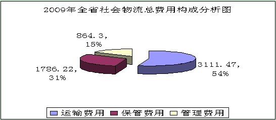 從2009年廣東省社會(huì)物流總費(fèi)用構(gòu)成來(lái)看,運(yùn)輸費(fèi)用為3111.47億元,按現(xiàn)價(jià)計(jì)算,同比增長(zhǎng)12.08%,占同期全省社會(huì)物流總費(fèi)用的54%;保管費(fèi)用為1786.22億元,按現(xiàn)價(jià)計(jì)算,同比增長(zhǎng)15.00%,占同期全省社會(huì)物流總費(fèi)用的31%;管理費(fèi)用為864.30,按現(xiàn)價(jià)計(jì)算,同比增長(zhǎng)2.62%,占同期全省社會(huì)物流總費(fèi)用的15%。