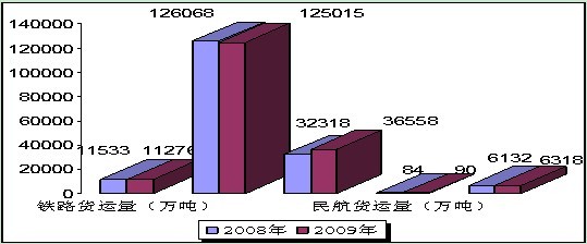 2009年,廣東省社會(huì)貨運(yùn)量累計(jì)完成179257萬(wàn)噸,同比增長(zhǎng)16.8%。其中,鐵路貨運(yùn)量累計(jì)完成11276萬(wàn)噸,同比下降2.3%;公路貨運(yùn)量累計(jì)完成125015萬(wàn)噸,同比下降0.84%;水運(yùn)貨運(yùn)量累計(jì)完成36558萬(wàn)噸,同比增長(zhǎng)7.7%;民航貨運(yùn)量累計(jì)完成90,同比增長(zhǎng)6.7%;管道運(yùn)輸量累計(jì)完成6318萬(wàn)噸,同比增長(zhǎng)0.88%。