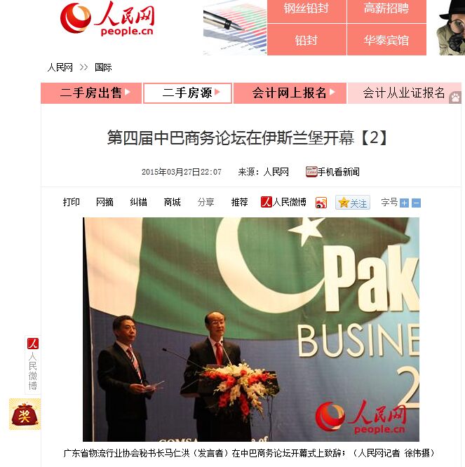 廣東省物流行業(yè)協(xié)會(huì)馬仁洪秘書長(zhǎng)唯一代表中方在開幕式上臺(tái)發(fā)言并獲得商貿(mào)部長(zhǎng)親自頒發(fā)證書嘉獎(jiǎng),出席該活動(dòng)有巴方商貿(mào)部長(zhǎng),中國(guó)駐巴大使孫衛(wèi)東,巴基斯坦駐廣州總領(lǐng)事巴伯•阿明等巴方各部長(zhǎng)、官員、學(xué)者及大批著名企業(yè)、中國(guó)駐巴公司、巴基斯坦商家和中小企業(yè)高層以及中巴高等學(xué)校及其他研究開發(fā)機(jī)構(gòu)共900人參加本次論壇,5天現(xiàn)場(chǎng)人員流量10萬(wàn)人次。為期5天的中巴商貿(mào)國(guó)際論壇活動(dòng)在31號(hào)下午隆重的閉幕式中圓滿落下帷幕。